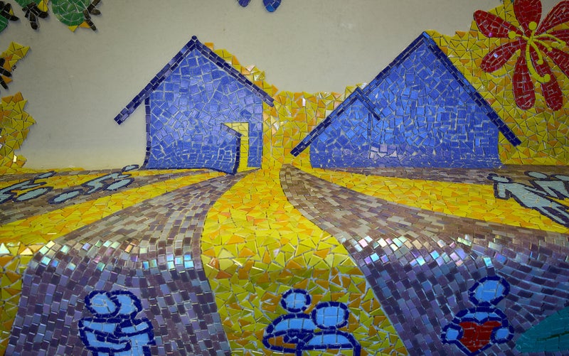 Aan de voor\rugzijde moet nog een groot stuk gemozaïekt worden. Dit is met name achtergrond, een mengeling van drie kleuren geel/oranje. Daarna zal het geheel nog gevoegd gaan worden door Vincent van Social Sofa. Hopelijk is men op tijd klaar zodat de geplande onthulling medio oktober doorgang kan vinden. Meer informatie daarover volgt nog.
