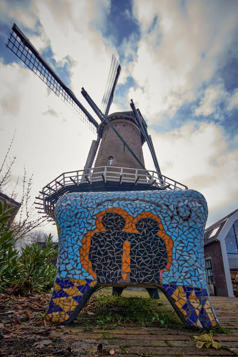 Het voetenbankje, de ‘social hocker’, is gebaseerd op de Social Sofa. Her project ‘social hocker’ kwam voort uit contacten met de stichting 200 jaar Best. Het idee van de hocker kwam toen men keek hoe het onderwijs invulling aan dit jubileum kunnen geven? Op het Heerbeeck College in Best werd voor het vijfde jaar op rij het Social Interaction-project georganiseerd. Er werd een wedstrijd uitgeschreven om een ontwerp te maken. Een leerling van de brugklas, Li van Boxmeer, van het Heerbeeck college maakte een prachtig ontwerp met bloemen en mensensilhouetten. Dit werd het ontwerp voor de hocker. Twaalf enthousiaste leerlingen kregen een cursus mozaïeken. Het werken aan de hocker was al een voorbeeld van sociale interactie aangezien het bankje op Campus Westerwind, samen met cliënten van Archipel Zorggroep en de Campus werd gemaakt. De Social Hocker mocht uiteindelijk bij de molen geplaatst worden. De Hocker is daar komen staan op 8 november 2019