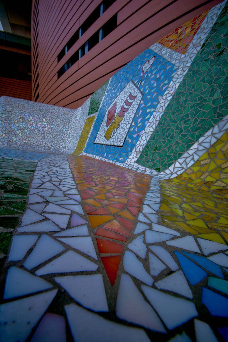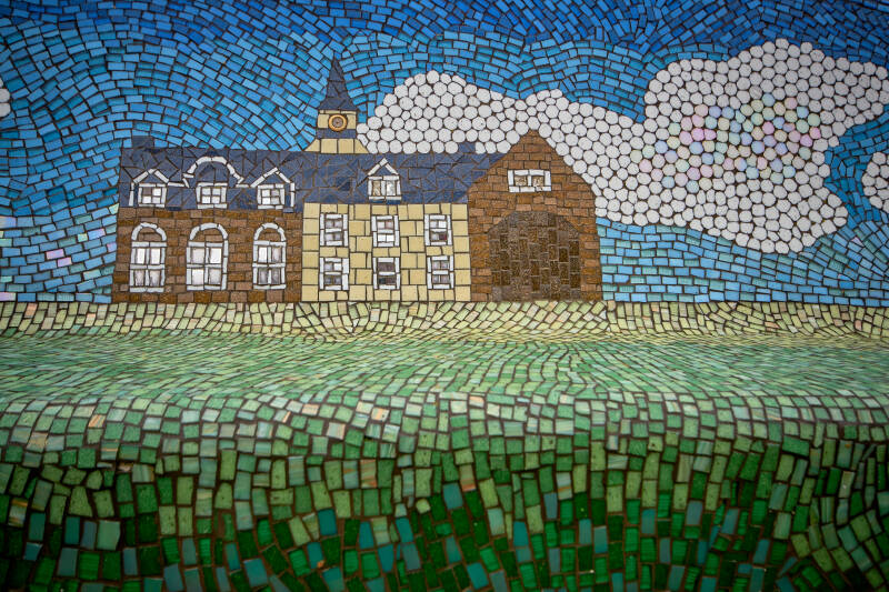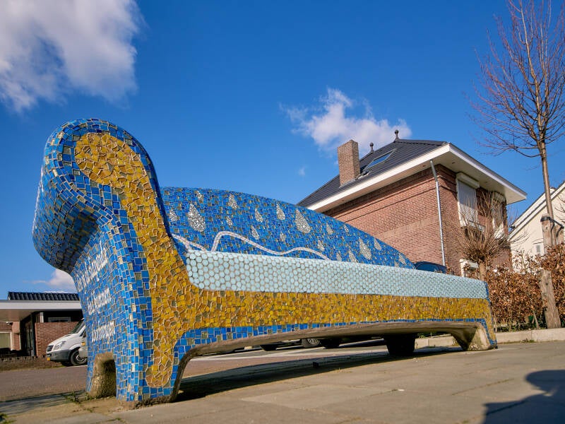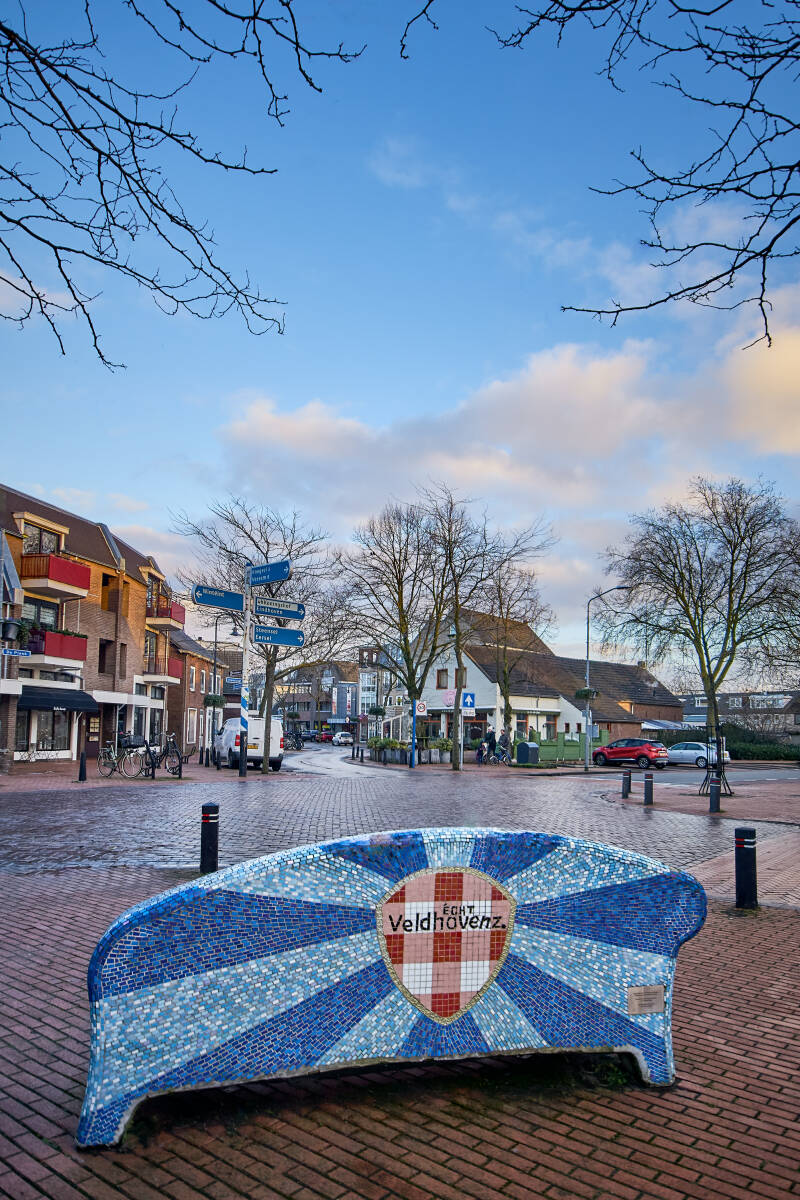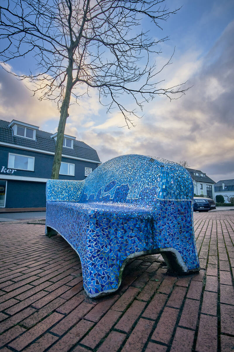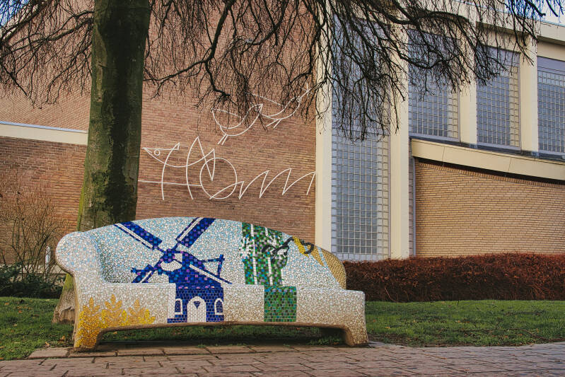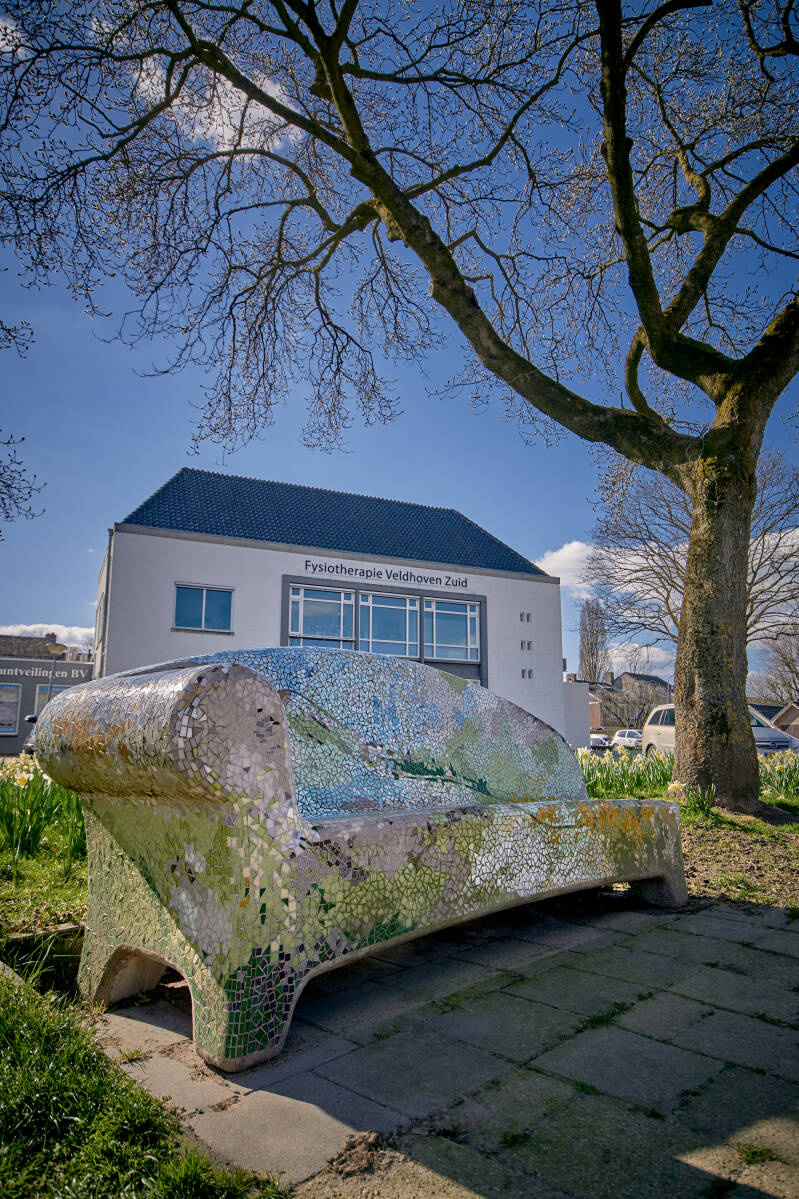 Over deze bank kan ik weinig informatie vinden op internet. Hij is ontworpen door Karin van den Boomen samen met Mama Design. Zoals in het Social Sofa project gestelde doel 'Het bevorderen van de sociale cohesie', is de bank gemozaïekt door bewoners van Veldhoven-dorp. Op 11 november 2011 is deze geplaatst.