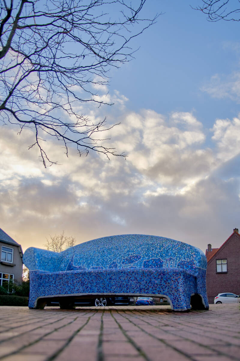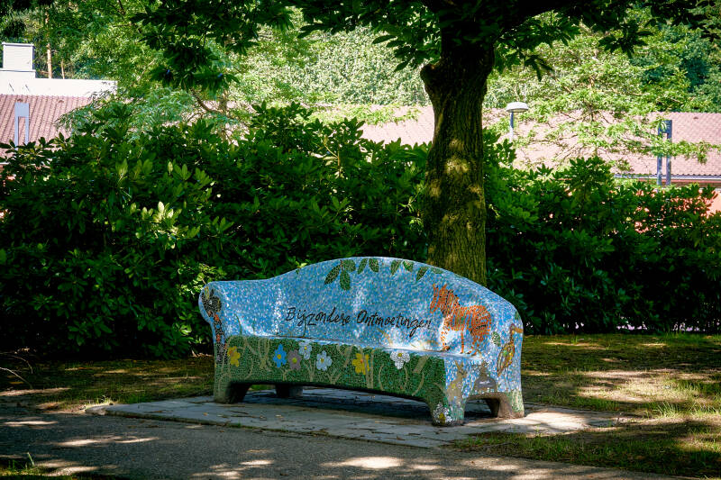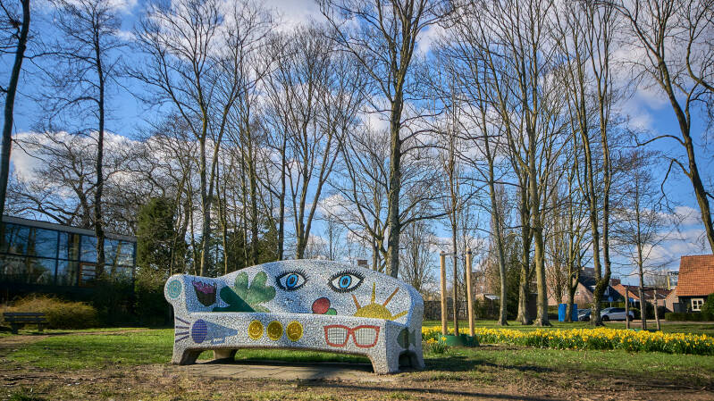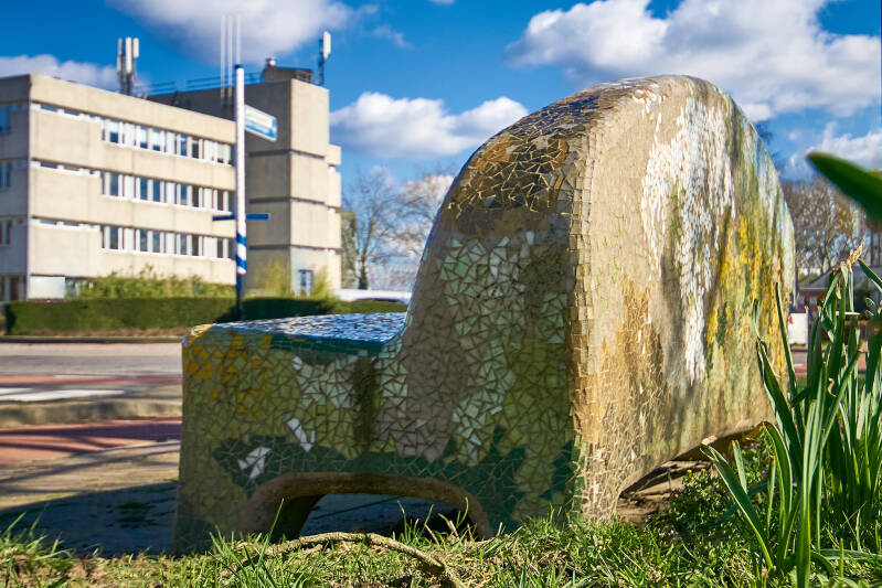 Deze bank staat zo ongeveer bij mij om de hoek. Als ik de bank zie denk ik altijd 'die mag wel eens gereinigd worden'. Hij heeft geen felle kleuren. Echter nu ik hem ging fotograferen valt me op dat hij eigenlijk weergeeft wat je altijd op die plaats ziet. De bloeiende grote magnolia bomen en de gele narcissen in het voorjaar. Hoe langer ik kijk hoe meer ik het detail van de omgeving zie. Toch belangrijk om eens stil te staan bij zo'n mooi gemozaïekt bankje en te kijken. Als je goed kijkt, zie je iemand languit op de bank! Deze Social Sofa staat hier sinds 26 oktober 2012.