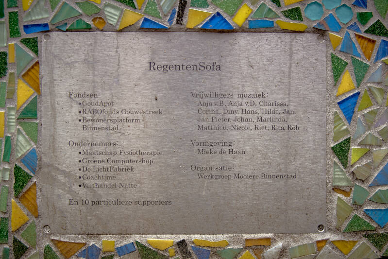 De Regentensofa, zoals deze genoemd is, is de eerst geplaatste Social Sofa in Gouda. Hij is 30 september 2018 in het Regentesseplatsoen geplaatst. Vanuit de bank heb je uitzicht op de boten en jachten en de Kattensingel. Ongeveer vijftien vrijwilligers hebben de bank gemozaïekt. Door het complexe, maar mooie ontwerp, van de Goudse kunstenares Mieke de Haan, zijn er beduidend meer uren in gaan zitten dan gemiddeld nodig is. Zij hebben dit werk uitgevoerd in een garage vlak bij de Vrouwentoren die hiervoor ter beschikking was gesteld. Bij het plaatsingsfeestje met drankjes en hapjes zijn veel betrokkenen voor het eerst op de Social Sofa gaan zitten. Iedereen kan nu genieten van het uitzicht van dit bankje. Het groen rondom het bankje is ook vernieuwd en is hierdoor heel fraai geworden. Deze Social Sofa is geplaatst op 30 september 2018